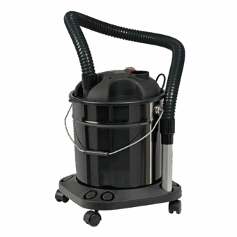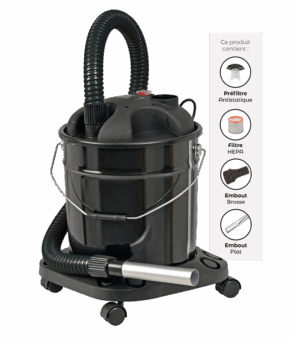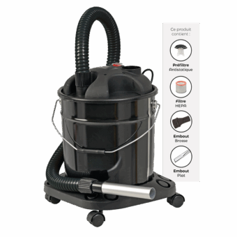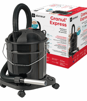 Aspirateur Granul’Express 1 200 W avec cuve 18 L, filtration HEPA, roulettes intégrées – performant pour aspirer les cendres et résidus de granulés.
