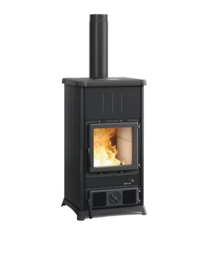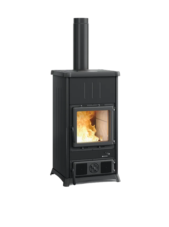 Poêle vertical en acier, haut rendement, design sobre et moderne.