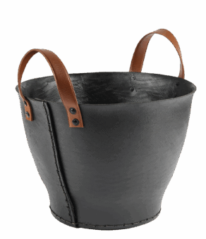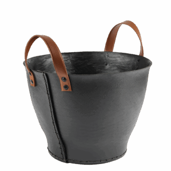 Corbeille à granulés Tinos en pneu recyclé noir – capacité 15 kg, dimensions Ø 40 × 29 cm, anses en simili.