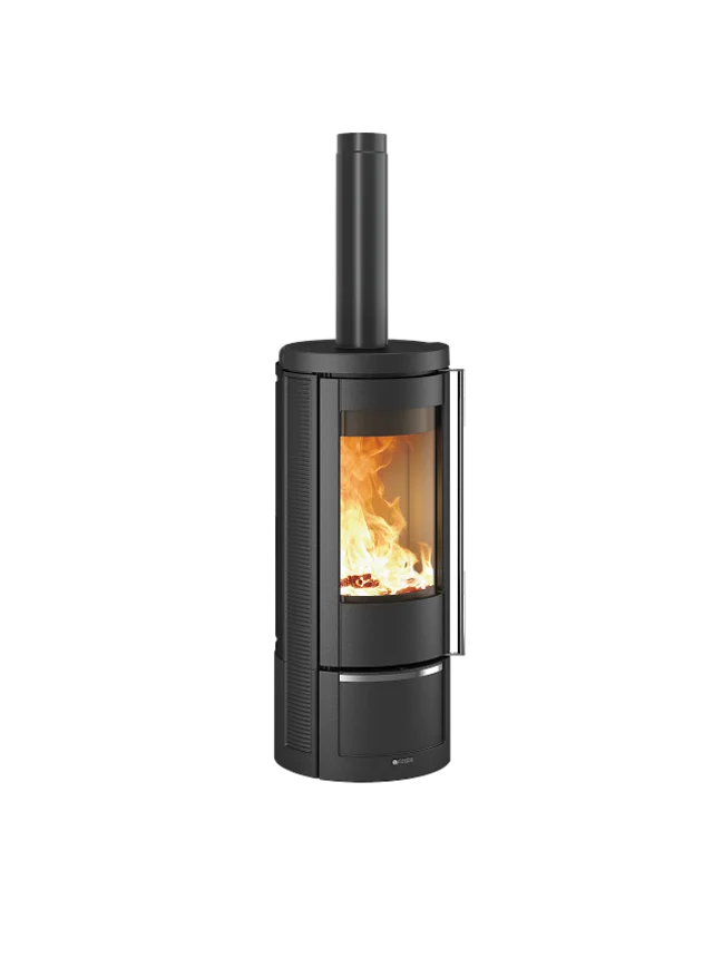 Poêle à bois haut de gamme en fonte avec finition céramique.