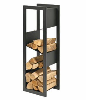 Range‑bûches Escale en acier noir givré – dimensions 35 × 30 × 111 cm, capacité ~35 bûches, design graphique moderne.