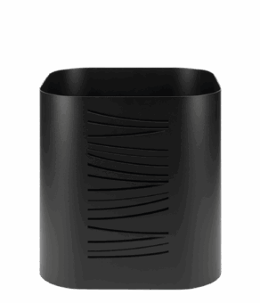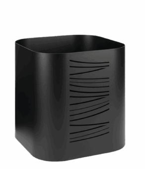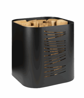 Range‑bûches Taïkal en acier noir givré – dimensions 37,5 × 37,5 × 38,5 cm, capacité 15 bûches, roulettes incluses.