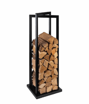 Range-bûches Vertigo en acier noir givré – capacité 45 bûches, dimensions 43 × 35 × 120 cm, sur roulettes.
