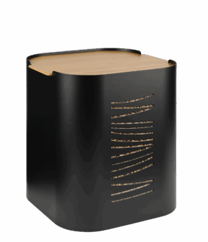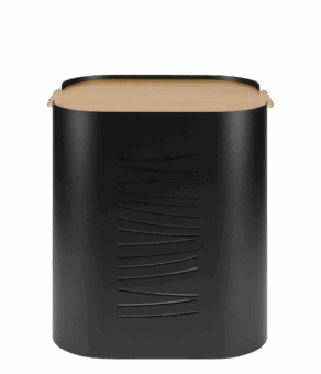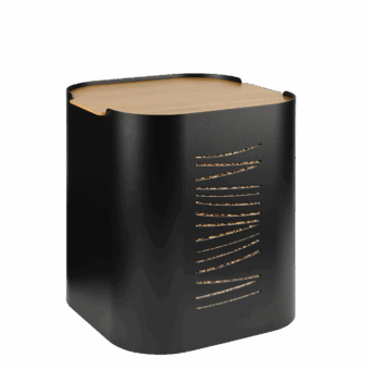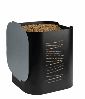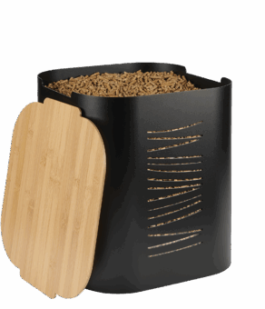 Réserve à granulés Stepia en acier et bambou, finition noir givré – capacité 30 kg avec motifs découpés et roulettes pour déplacement facile.