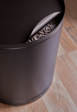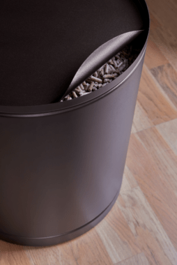 Réserve à granulés Villa en acier noir givré, capacité 30 kg, format cylindrique 39,5 × 46,5 cm, avec roulettes et couvercle à poignée intégrée.