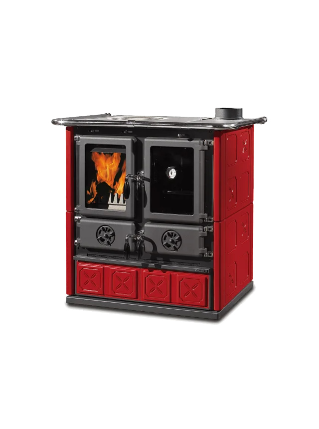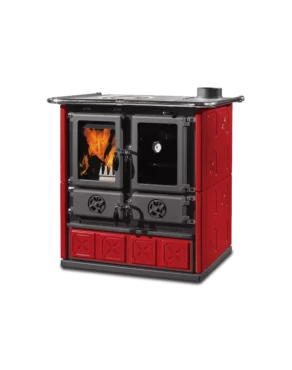 Cuisinière bois compacte avec habillage en faïence artisanale.