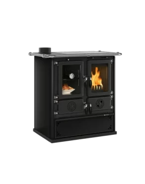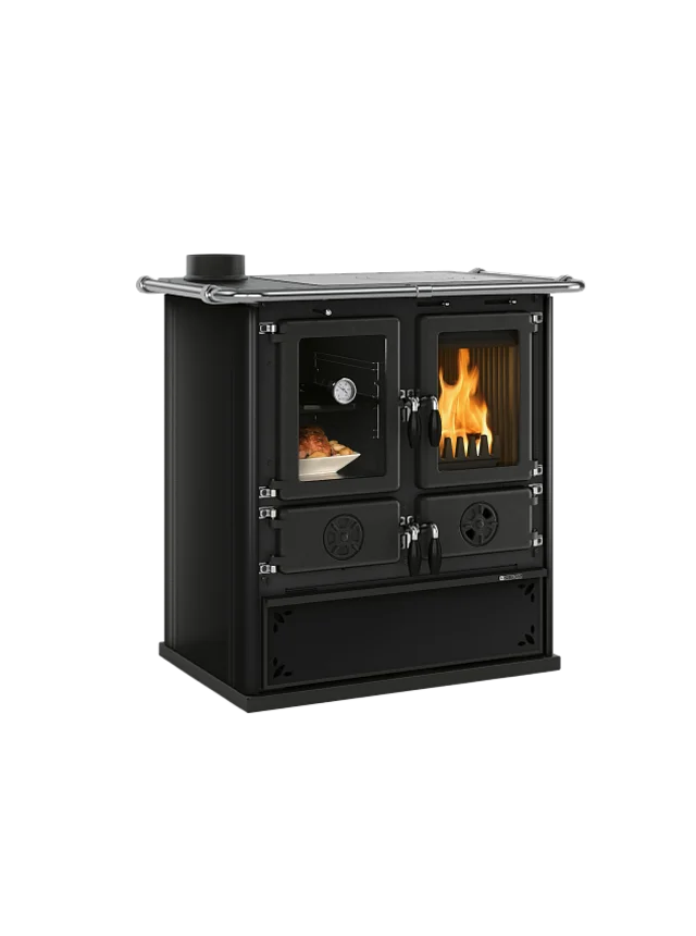 Cuisinière bois compacte avec ouverture à gauche et finition acier.