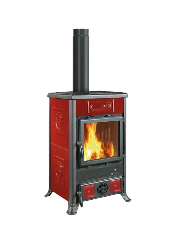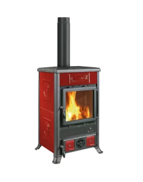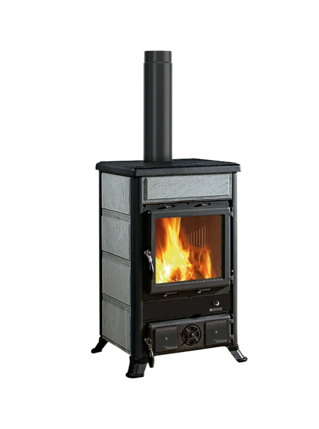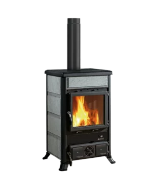 Poêle en fonte avec habillage céramique, style rustique, 8,8 kW.