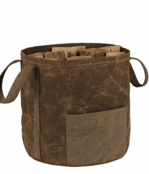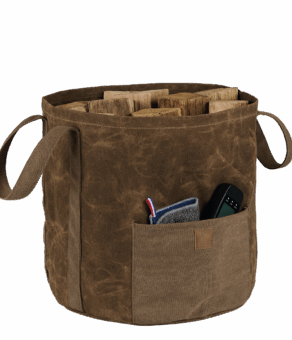 Sac à bûches Vercors en toile cirée marron – Ø 40 × 38 cm, capacité ~15 bûches, poche frontale et anses renforcées.