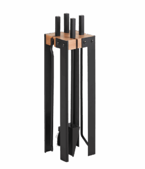 Serviteur de cheminée Duplex en acier noir givré et bois – dimensions 15 × 15 × 52 cm, livré avec 4 accessoires de nettoyage.