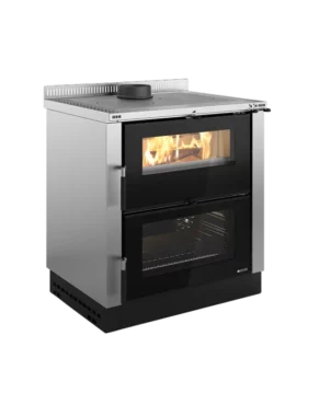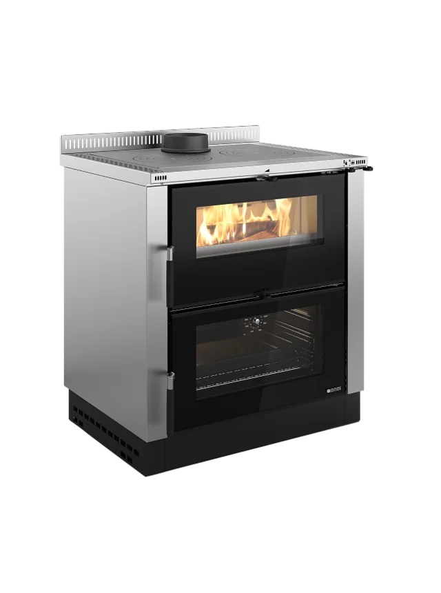 Grande cuisinière bois encastrable, avec four 68 L et haut rendement énergétique.